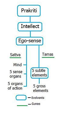 The intellect is the first evolute of prakriti and is called mahat or the great one. It causes the evolution of ego-sense or self-consciousness. Evolution from self-consciousness is affected by the dominance of gunas. So dominance of sattva causes the evolution of the five organs of perception, five organs of action and the mind. Dominance of tamas triggers the evolution of five subtle elements- sound, touch, sight, taste, smell from self-consciousness. These five subtle elements are themselves evolvents and cause the creation of the five gross elements space, air, fire, water and earth. Rajas is cause of action in the evolutes. Purusha is pure consciousness absolute, eternal and subject to no change. It is neither a product of evolution, nor the cause of any evolute.